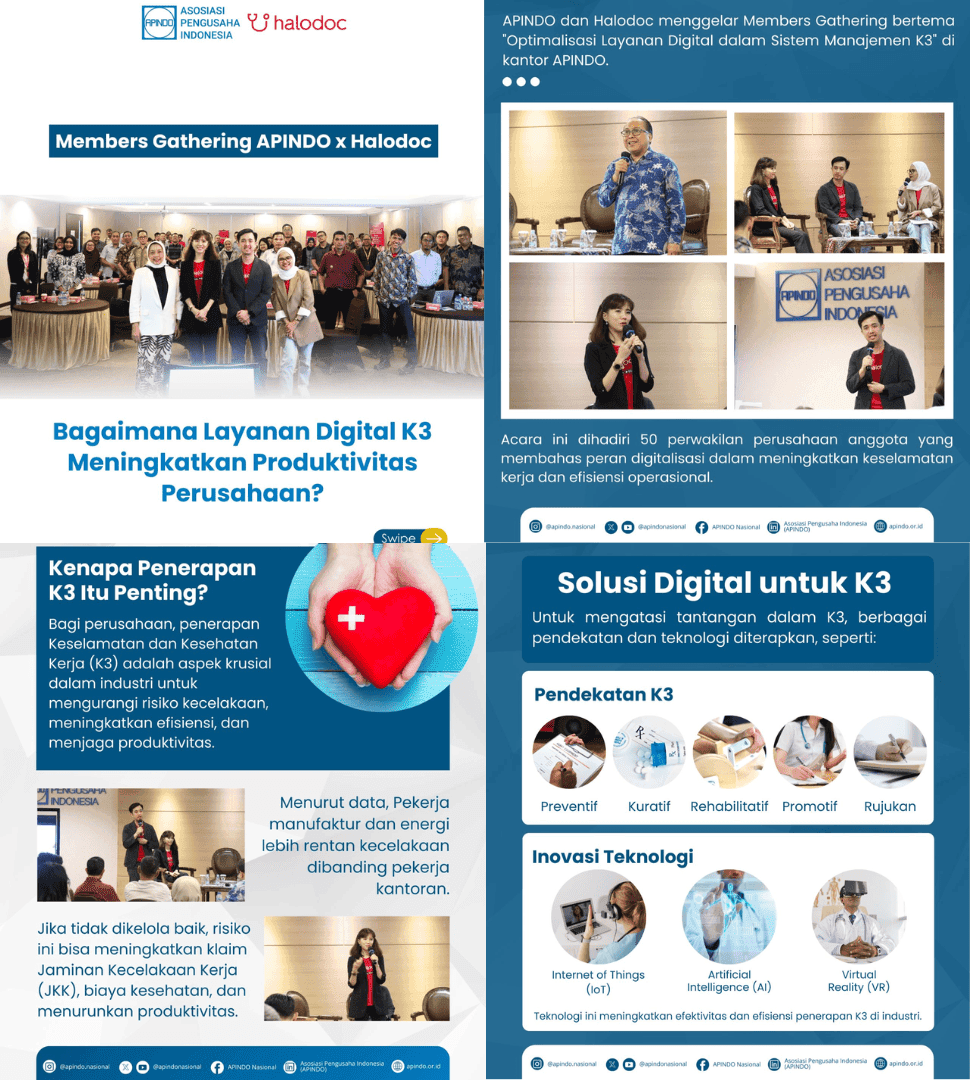 Dalam Members Gathering APINDO bersama Halodoc, dibahas bagaimana IoT, AI, VR, serta layanan digital seperti telemedicine dan monitoring kesehatan dapat membantu perusahaan mengurangi risiko kecelakaan kerja dan meningkatkan produktivitas.